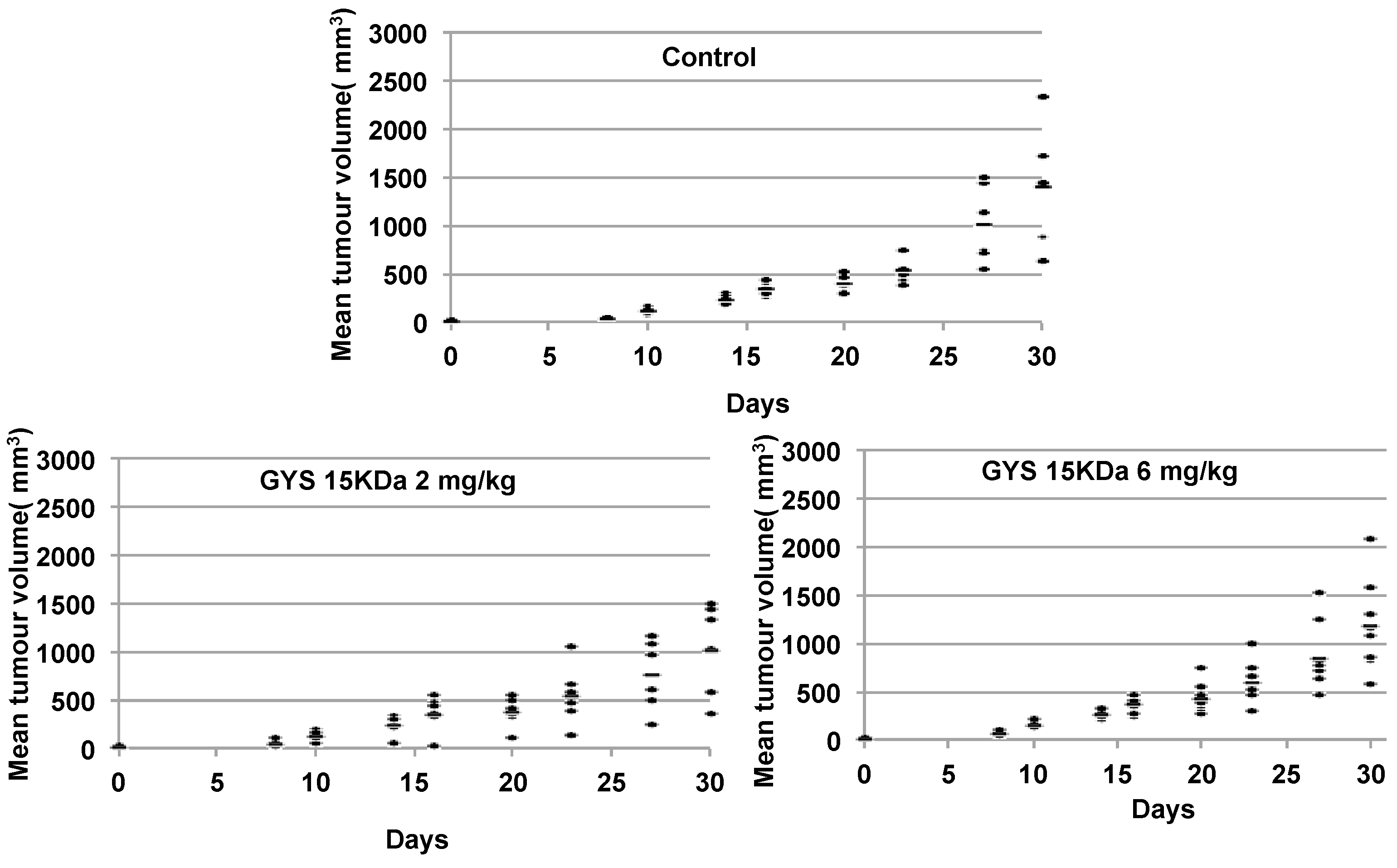 Effect of OS-EPS 15 kDa derivative on the in vivo HOS osteosarcoma tumor growth: 2 × 106 HOS cells were inoculated in paratibial area. When tumor volume reached 100 mm3, OS-EPS 15 kDa (2 or 6 mg/kg daily) was injected subcutaneously each day and the tumor growth was measured from Day 5 to Day 30.