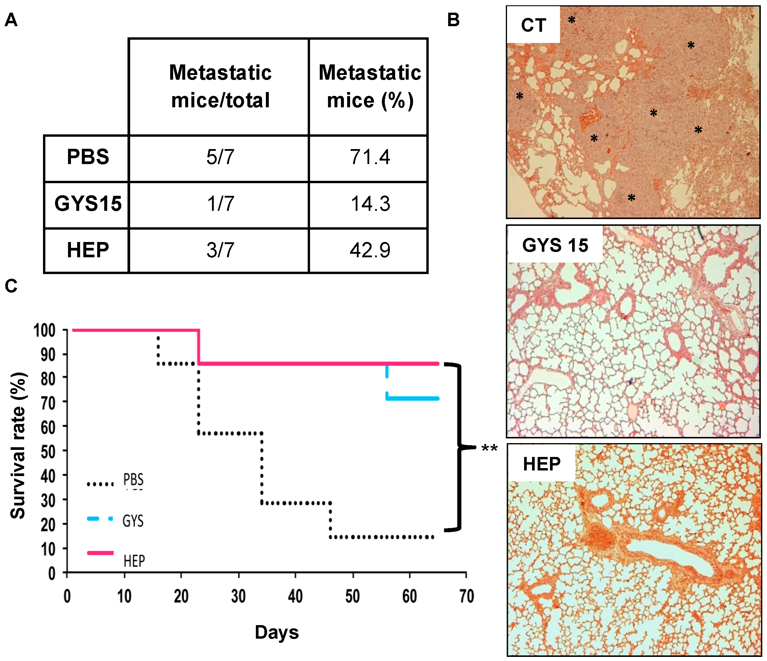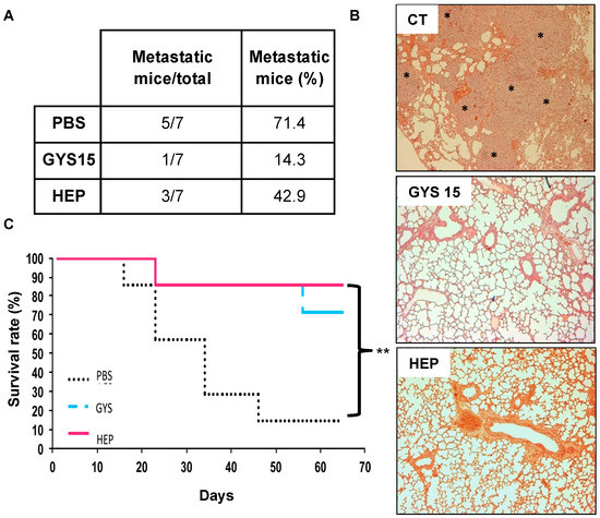 Effect of OS-EPS 15 kDa derivative on the lung metastatic incidence: (A) metastatic incidence in treated animals (OS-EPS derivative or heparin; s.c. 6 mg/kg daily) vs. control (PBS); (B) histological analyses of the lung tissue of treated animals or not (* metastatic foci), original magnification: 400×; and (C) survival rate (%) of treated animals (OS-EPS derivative or heparin) compared to the control group (PBS), Kaplan–Meier survival curves. n = 7 mice/group; ** p < 0.01.