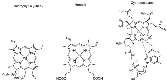 Porphyrins and their derivatives are a class of naturally occurring macrocyclic compounds with intense colour, that have been extensively studied [7,8,9] due to the key role played in some life processes (Figure 1 and Figure 2) and involving their special aromatic structure (18π electrons). A suitable example that can be given is the heme group which contains an iron-porphyrin complex which coordinates oxygen and carbon dioxide for cellular carriage [10], responsible for cellular respiration, and contributing to the catalytic activities of many enzymes as cofactors [11]. This is one of the reasons why porphyrin-derived pigments are called “the Pigments of Life” (Figure 1 and Figure 2) [12,13].
