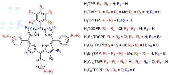 The development of metalloporphyrin catalysts as synthetic tools has recently evolved significantly [19]. For instance, in catalytic C–H oxidation reactions, the simplest metalloporphyrins without substituents at the meso positions are not useful because they undergo fast oxidative degradation [20]. The degradation process (the catalase reaction) leads to hydroxylation at the meso position, followed by other processes that occur in natural heme degradation, in order to form meso-hydroxyporphyrin derivatives which then inactivate the catalytic activity [20]. Therefore, it has been demonstrated that the introduction of phenyl or related groups at the meso positions (Figure 3) is a good strategy which provides efficient catalytic oxidations by protecting these reactive sites [19].