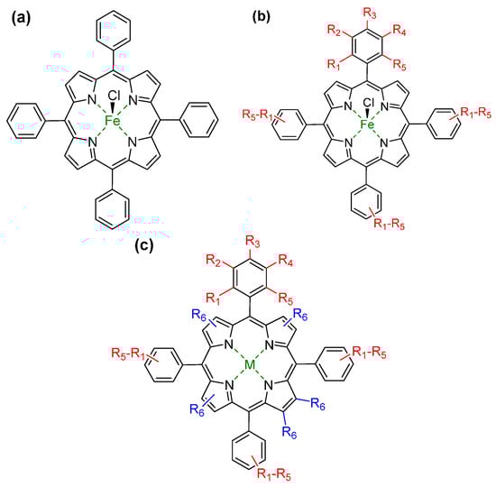 Classification of metalloporphyrin catalysts. (a) First generation; (b) Second generation; (c) Third generation. R1–R5 represent EWG or bulky groups and R6 halogens.