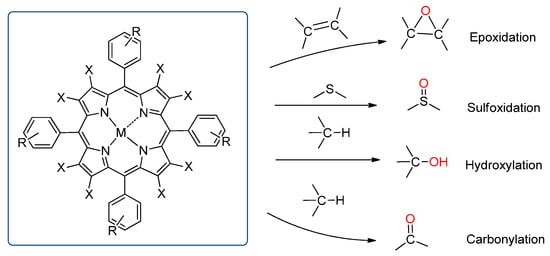 The inert nature of C–H bonds requires the use of highly reactive reagents and stoichiometric amounts of oxidizing agents such as strong inorganic acids, peroxyacids, or highly toxic oxo–metal oxidants; all yield products with low chemo, regio and stereoselectivity, and generate large amounts of toxic waste [26]. However, since the discovery of cytochrome P450, the use of metalloporphyrin catalysts has emerged as an alternative for controlled oxidation reactions in the above aspects (Figure 5) [27].