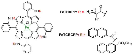 The complexes FeTHAPP and FeTCBCPP (Figure 6) are examples of metalloporphyrins which are able to perform asymmetric induction in the presence of either PhIO or iodosylmesitylene as oxygen donors, achieving products with enantioselectivities up to 50% and a turnover number (TON) near to 100 [36].