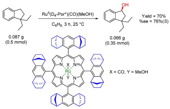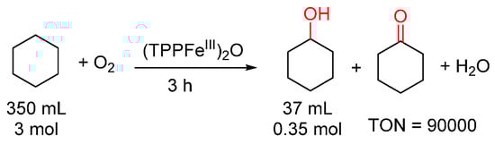 Once the mechanism by which the cytochrome P-450 acts as catalyst in C–H functionalization became known [59], with an iron porphyrin core as the active site, many synthetic metalloporphyrins have been studied as catalyst for this purpose with different organic substrates [60,61]. In fact, this is one of the most difficult transformations for the petrochemical industry, and one of the major challenge to convert petroleum derivatives into chemicals of higher value [62].