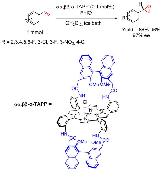 Optically active epoxides obtained from the catalytic enantioselective epoxidation of alkenes are important intermediates in asymmetric synthesis, since these compounds are very useful for the synthesis of chirons with up to two contiguous stereogenic centres [37,38]. Chiral epoxidation of allylic alcohols provides interesting building blocks for the asymmetric synthesis of biologically active compounds, and consequently, asymmetric epoxidation of allylic alcohols has been extensively developed [39]. Chiral non-racemic iron porphyrins with binaphthyl moieties linked to the macrocycle allow the enantioselective epoxidation of non-functionalized terminal olefins with good enantioselectivity (>97% for styrene) and high turnover numbers (>16,000) (Scheme 4) [35,40].