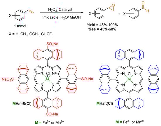 In general, iron porphyrins present good reactivity to catalyse two primary reactions, namely the enantioselective transfer of an oxygen atom from the hydrogen peroxide to the substrate, and the decomposition of the peroxide in water and oxygen [41]. On the other hand, the use of manganese porphyrins as catalysts with hydrogen peroxide as oxidant, yield low enantiomeric excesses for epoxidations in organic solvents or biphasic medium [42].