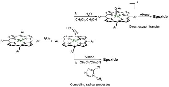Scheme 6 shows how the reaction conditions affect the total conversion of alkenes when an iron porphyrin is employed as catalyst in a mixture of dichloromethane and methanol. In this case, direct oxygen transfer to obtain the epoxide is observed from the high-valent Fe(IV)-porphyrin radical cation complex (path A) [37]. On the other hand, when an aprotic solvent such as acetonitrile is used, the reactive intermediate is more likely to be the iron hydroperoxide complex, leading to the generation of competing radicals, thus promoting low selectivity and yield even though an imidazole is added to help the stabilization of the intermediate (path B) [37].