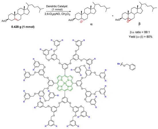 Che and co-workers investigated the catalytic properties of the catalyst for the epoxidation of unsaturated cholesteryl esters with 2,6-Cl2pyNO in dichloromethane using just 0.1 mol % of the dendritic ruthenium porphyrin catalyst (Scheme 7) [48].