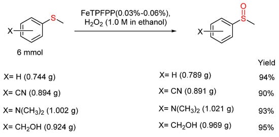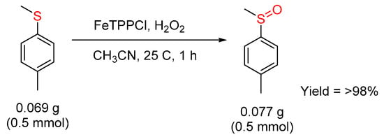 - Baciocchi, E.; Gerini, M.F.; Lapi, A. Synthesis of sulfoxides by the hydrogen peroxide induced oxidation of sulfides catalysed by iron tetrakis(pentafluorophenyl)porphyrin: Scope and chemoselectivity. J. Org. Chem. 2004, 69, 3586–3589. [Google Scholar] [CrossRef] [PubMed]
