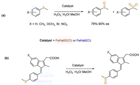 Another example of an enantioselective oxidation of sulfides (small scale) catalysed by a chiral manganese porphyrin in an aqueous methanol solution in the presence of H2O2 furnished the non-steroidal anti-inflammatory drug Sulindac® (Banyu Pharmaceutical Co., Ltd., Tokyo, Japan) (Scheme 10b) [57].