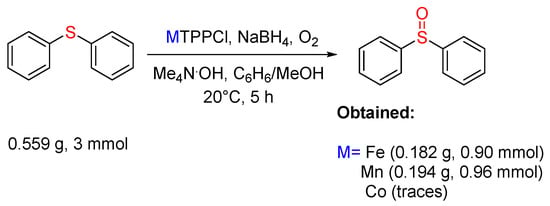 Nonetheless, the formation of sulfoxides using metalloporphyrins as catalyst can be achieved by other methodologies, but in this case, on a superior scale. The use of oxygen as the oxidant with NaBH4 and Me4NOH, [58] is an example to obtain the oxidized product of diarylsulfide compounds (Scheme 11).