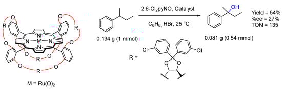 Che and co-workers [66] reported the Ru-catalysed enantioselective hydroxylation of aromatic hydrocarbons with benzylic C–H bonds. Using 2,6-Cl2pyNO as oxidant, the chiral ruthenium porphyrin was shown to be an effective catalyst for hydroxylating a series of aromatic hydrocarbons to form the corresponding secondary alcohols. Although the conversion of the substrates was incomplete, the Ru-based hydroxylation gave yields up to 76% ee (Scheme 14).