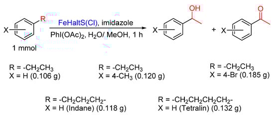 - Han, J.H.; Yoo, S.; Seo, S.; Hong, J.; Kim, K.; Kim, C. Biomimetic alcohol oxidations by an iron(III) porphyrin complex: Relevance to cytochrome P-450 catalytic oxidation and involvement of the two-state radical rebound mechanism. Dalton Trans. 2005, 2, 402–406. [Google Scholar] [CrossRef] [PubMed]