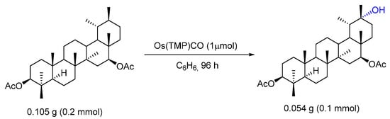 - Ogawa, S.; Wakatsuki, Y.; Makino, M.; Fujimoto, Y.; Yasukawa, K.; Kikuchi, T.; Ukiya, M.; Akihisa, T.; Iida, T. Oxyfunctionalization of unactivated C-H bonds in triterpenoids with tert-butylhydroperoxide catalysed by meso-5,10,15,20-tetramesitylporphyrinate osmium(II) carbonyl complex. Chem. Phys. Lipids 2010, 163, 165–171. [Google Scholar] [CrossRef] [PubMed]