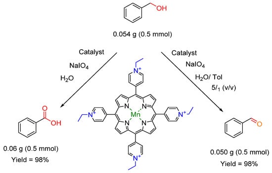 - Ren, Q.-G.; Chen, S.-Y.; Zhou, X.-T.; Ji, H.-B. Highly efficient controllable oxidation of alcohols to aldehydes and acids with sodium periodate catalysed by water-soluble metalloporphyrins as biomimetic catalyst. Bioorg. Med. Chem. 2010, 18, 8144–8149. [Google Scholar] [CrossRef] [PubMed]