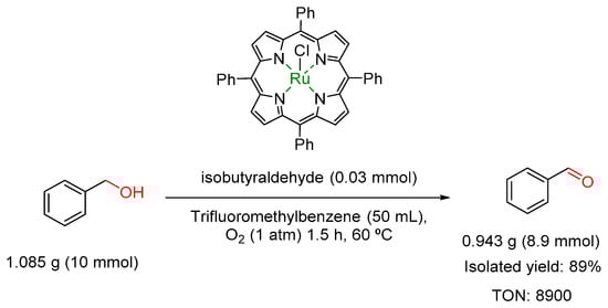 Ji and co-workers reported a selective oxidation of alcohols to carbonyl compounds by molecular oxygen with isobutyraldehyde as oxygen acceptor in the presence of ruthenium (III) meso-tetraphenylporphyrin chloride (Ru(TPP)Cl) (Scheme 19) [80]. In addition, they found that the catalytic activity and selectivity of metalloporphyrins towards benzaldehydes appeared to be dependent on the nature of the central ion, and were influenced by the stability of different valences of the metal atoms and their respective electric potential.