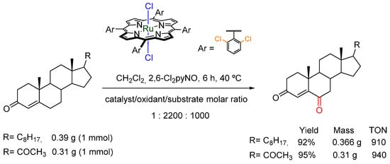 - Zhang, J.L.; Che, C.M. Dichlororuthenium(IV) complex of meso-Tetrakis(2,6-dichlorophenyl) porphyrin: Active and robust catalyst for highly selective oxidation of arenes, unsaturated steroids, and electron-deficient alkenes by using 2,6-dichloropyridine N-oxide. Chem. Eur. J. 2005, 11, 3899–3914. [Google Scholar] [CrossRef] [PubMed]
