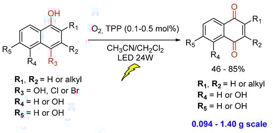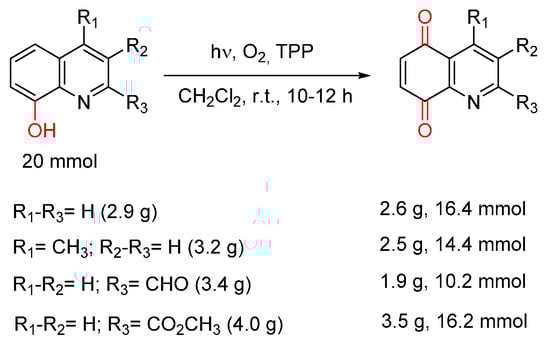 - Cossy, J.; Belotti, D. Efficient synthesis of substituted quinoline-5,8-quinones from 8-hydroxyquinolines by photooxygenation. Tetrahedron Lett. 2001, 42, 4329–4331. [Google Scholar] [CrossRef]