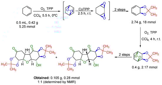 - Paddock, V.L.; Phipps, R.J.; Conde-Angulo, A.; Blanco-Martin, A.; Giró-Mañas, C.; Martin, L.J.; White, A.J.P.; Spivey, A.C. (±)-trans,cis-4-Hydroxy-5,6-di-O-isopropylidenecyclohex-2-ene-1-one: Synthesis and facile dimerization to decahydrodibenzofurans. J. Org. Chem. 2011, 76, 1483–1486. [Google Scholar] [CrossRef] [PubMed]