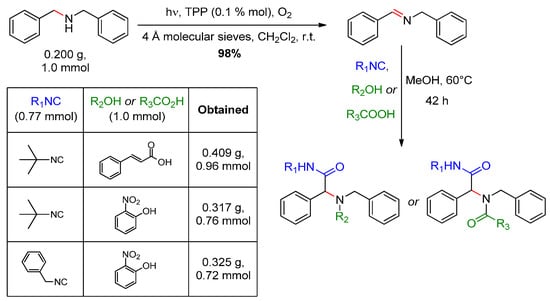 - Jiang, G.; Chen, J.; Huang, J.-S.; Che, C.-M. Highly efficient oxidation of amines to imines by singlet oxygen and its application in Ugi-type reactions. Org. Lett. 2009, 11, 4568–4571. [Google Scholar] [CrossRef] [PubMed]