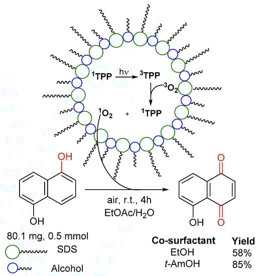 - Nardello, V.; Hervé, M.; Alsters, P.L.; Aubry, J.-M. “Dark” singlet oxygenation of hydrophobic substrates in environmentally friendly microemulsions. Adv. Synth. Catal. 2002, 344, 184–191. [Google Scholar] [CrossRef]