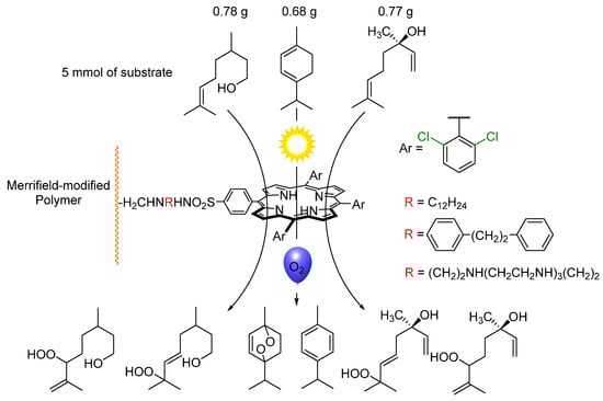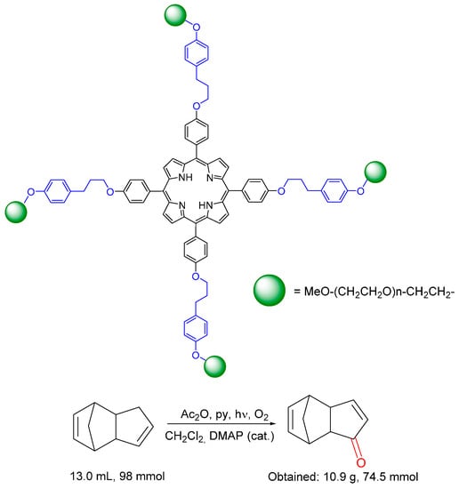 - Benaglia, M.; Danelli, T.; Fabris, F.; Sperandio, D.; Pozzi, G. Poly(ethylene glycol)-supported tetrahydroxyphenyl porphyrin: A convenient, recyclable catalyst for photooxidation reactions. Org. Lett. 2002, 4, 4229–4232. [Google Scholar] [CrossRef] [PubMed]