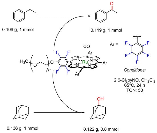 - Zhang, J.-L.; Huang, J.-S.; Che, C.-M. Oxidation chemistry of poly(ethylene glycol)-supported carbonylruthenium(II) and dioxoruthenium(VI)meso-Tetrakis(pentafluorophenyl)porphyrin. Chem. Eur. J. 2006, 12, 3020–3031. [Google Scholar] [CrossRef] [PubMed]