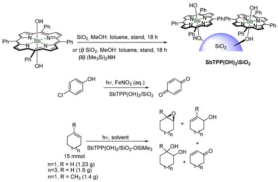 - Shiragami, T.; Makise, R.; Inokuchi, Y.; Matsumoto, J.; Inoue, H.; Yasuda, M. Efficient photocatalytic oxidation of cycloalkenes by dihydroxo(tetraphenylporphyrinato)antimony supported on silica gel under visible light irradiation. Chem. Lett. 2004, 33, 736–737. [Google Scholar] [CrossRef]