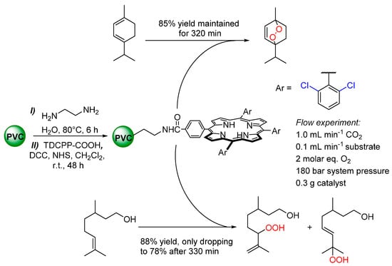 - Han, X.; Bourne, R.A.; Poliakoff, M.; George, M.W. Immobilised photosensitisers for continuous flow reactions of singlet oxygen in supercritical carbon dioxide. Chem. Sci. 2011, 2, 1059–1067. [Google Scholar] [CrossRef]