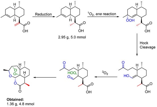 - Amara, Z.; Bellamy, J.F.B.; Horvath, R.; Miller, S.J.; Beeby, A.; Burgard, A.; Rossen, K.; Poliakoff, M.; George, M.W. Applying green chemistry to the photochemical route to artemisinin. Nat. Chem. 2015, 7, 489–495. [Google Scholar] [CrossRef] [PubMed]