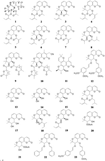 - Zhang, J.X.; Fong, W.F.; Wu, J.Y.; Yang, M.; Cheung, H.Y. Pyranocoumarins isolated from Peucedanum praeruptorum as differentiation inducers in human leukemic HL-60 cells. Planta Med. 2003, 69, 223–239. [Google Scholar] [CrossRef] [PubMed]