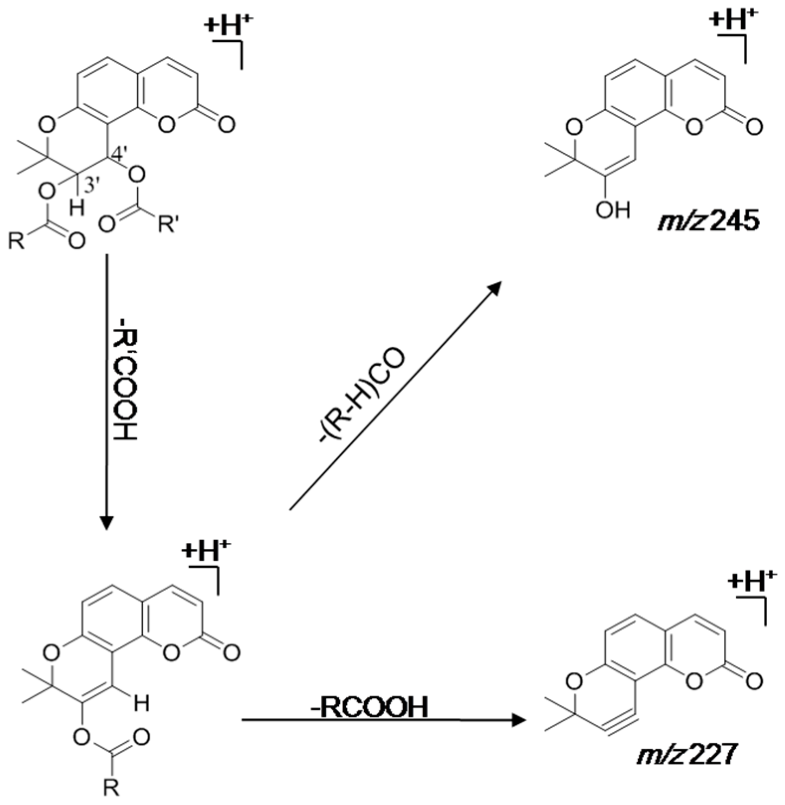 Proposed cracking rules of khellactone derivatives using electrospray ionization-tandem mass spectrometry.