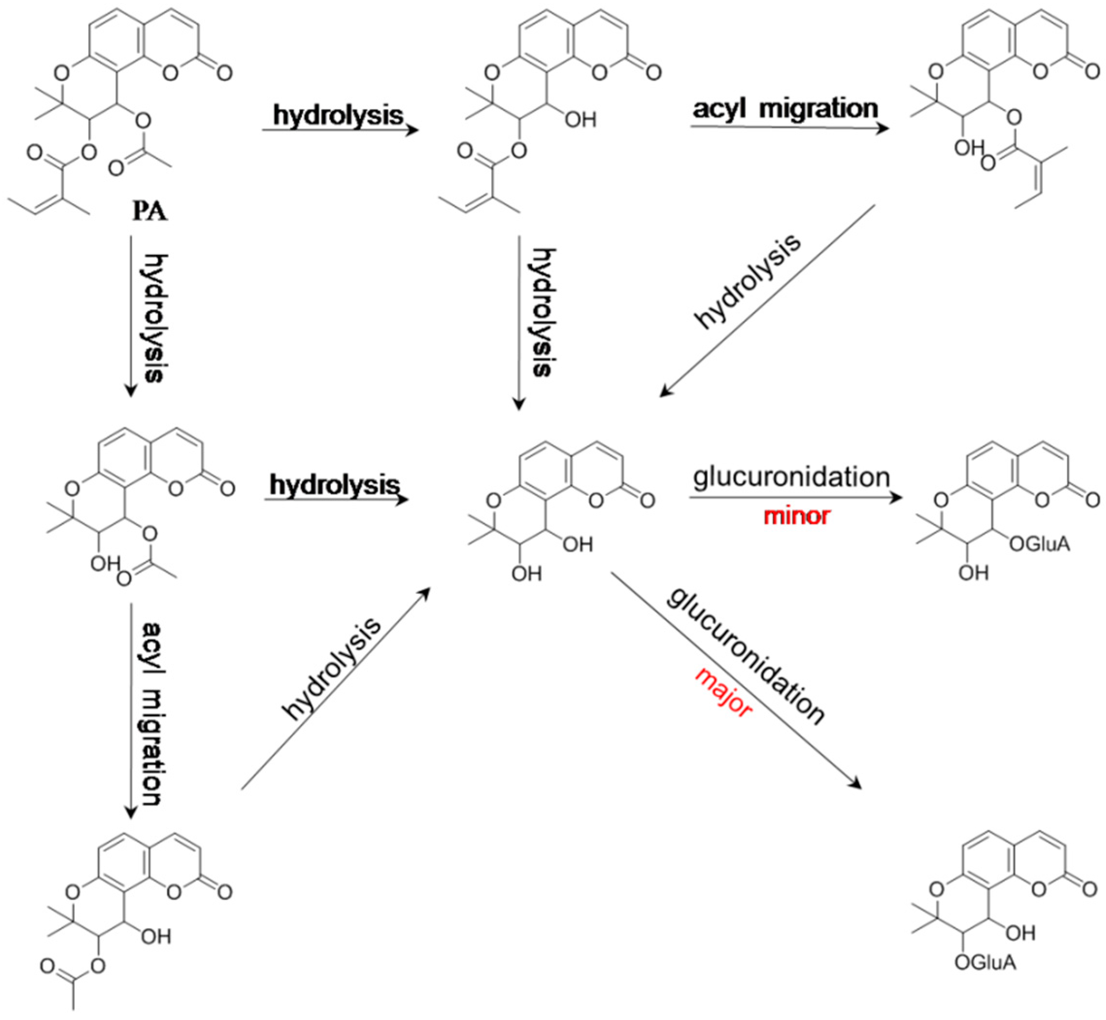 The fecal and urinary samples after oral dosement of PA (1) were analyzed using LC-MS/MS in our group, the original form of PA (1) can be excreted through both pathways [54]. Whereas, low total recoveries were revealed for PA (1) within 24 h (0.120% in urine and 0.009% in feces), suggesting that quite a small portion of PA could be excreted in the original form through urine and feces, which might be caused by significant liver-mediated first pass effect [39]. In addition, a number of KDs′ prototypes were detected in the feces and urine following orally administered Peucedani Radix extract at a dose of 1000 mg/kg [42].