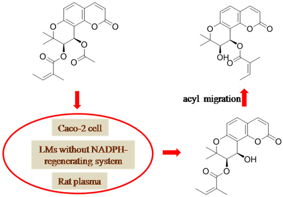 Because the entire blood supply of the upper gastrointestinal tract passes through the liver prior to its arrival of the systemic circulation, the drug may be bio-transferred by the enzymes in either liver or intestine during the first passage of drug absorption. In general, the higher drug permeability and the greater metabolic clearance correspond to a higher lipophilicity, and thereby more extensive first-pass elimination [55]. KDs usually bear the khellactone skeleton with two acyloxy groups, one at the C-3′ position while the other is at C-4′, suggesting KDs always show high lipophilicity (logP usually among 1–5). Consequently, it is not surprising to note that KDs feature low metabolic stability and low bioavailablity in most cases. Not only the enzymes in liver and gut, but also the carboxylesterases in rat plasma were reported to possess the catalytic abilities for KDs [7,9,10,40,50,54,56,57,58]; however, the gut bacteria-catalyzed metabolism hasn′t been reported for this kind of coumarins [54]. Taking lPA (3) for instance, its prototype is undetectable even following intravenous administration, let alone oral treatment, while most portion of dPA (2) can be quickly metabolized into lCK (14) and some other metabolites owing to the extensive distribution of isozymes in both intestine and liver tissues.