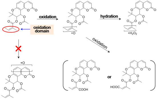 The oxidation of coumarins has been extensively studied in vivo and in vitro, and coumarins can be transferred via a number of metabolic pathways, among which 3-hydroxylation and 3,4-epoxidation are demonstrated as the prominent pathways for coumarin in rat liver microsomes, and most coumarin oxidation are catalyzed predominately by CYP3A [63,64,65,66]. On the basis of this rule, Ruan et al. [57] suggested that PA underwent oxidation at the skeleton of coumarin. However, the oxidation site was finally placed on the side chains at C-3′ and C-4′ by our group and some other groups using the well proposed mass fragmentation patterns of KDs [9,54,58,59,61]. Step-wise oxidation was reported for KDs, from methyl group, to hydroxymethyl, then to aldehyde group, and even to carboxy group at last, such as the oxidation pathways of PA (1) [54] and CMDCK (10) [54,58].