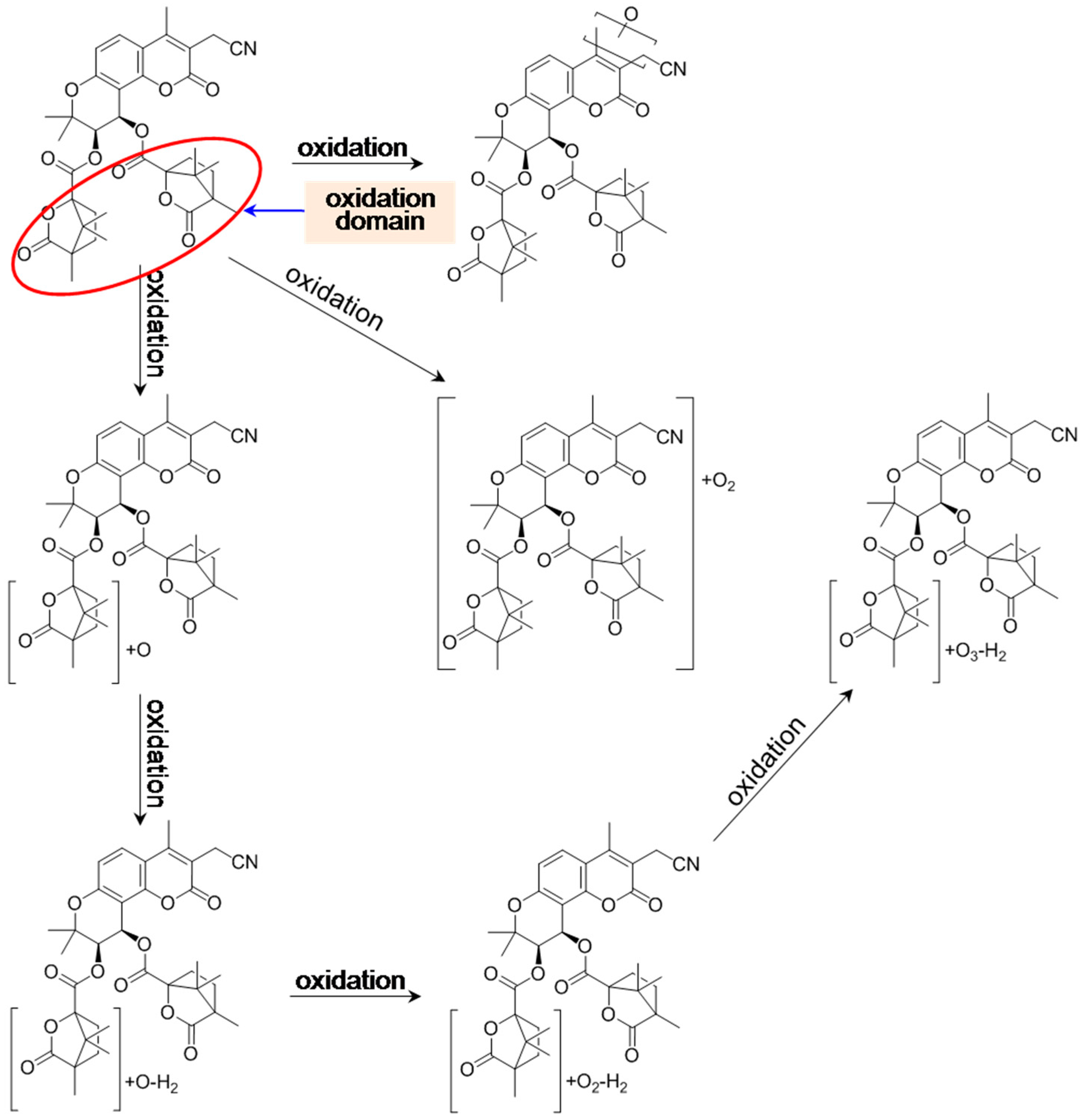 Proposed oxidation-initiated metabolic pathways of 3′,4′-di-O-(S)-camphanoyl-3-cyanomethyl-4-methyl-(+)-cis-khellactone (CMDCK) in vitro.