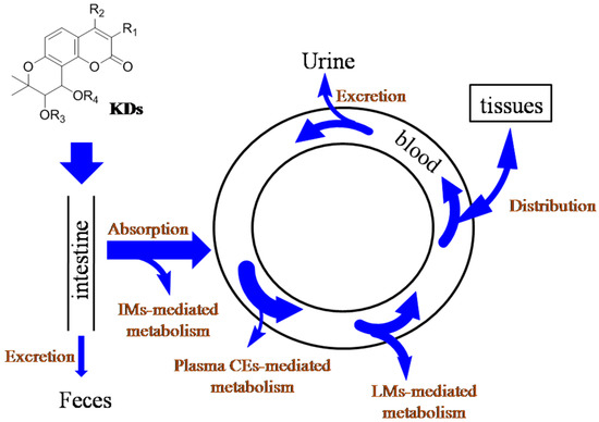 Above all, the ADME courses of KDs following oral administration are summarized in Figure 7. Firstly, the intestinal barrier only slightly hinders the absorption of KDs, and intestinal bacteria could not mediate the metabolism of KDs. And then, the critical roles of intestinal microsomes, liver microsomes, and plasma carboxylesterases were demonstrated for the elimination of KDs from circulation system. At the meanwhile, urine-mediated excretion could be taken place for KDs. The wide tissue distribution could also impact the concentration of KDs in blood, in particular blood-supply tissues, such as heart, spleen, and lung, and KDs could cross BBB to achieve brain distribution. The attempts to improve the plasma concentration and oral bioavailability of KDs should pay attention to their crucial metabolism-mediated elimination.