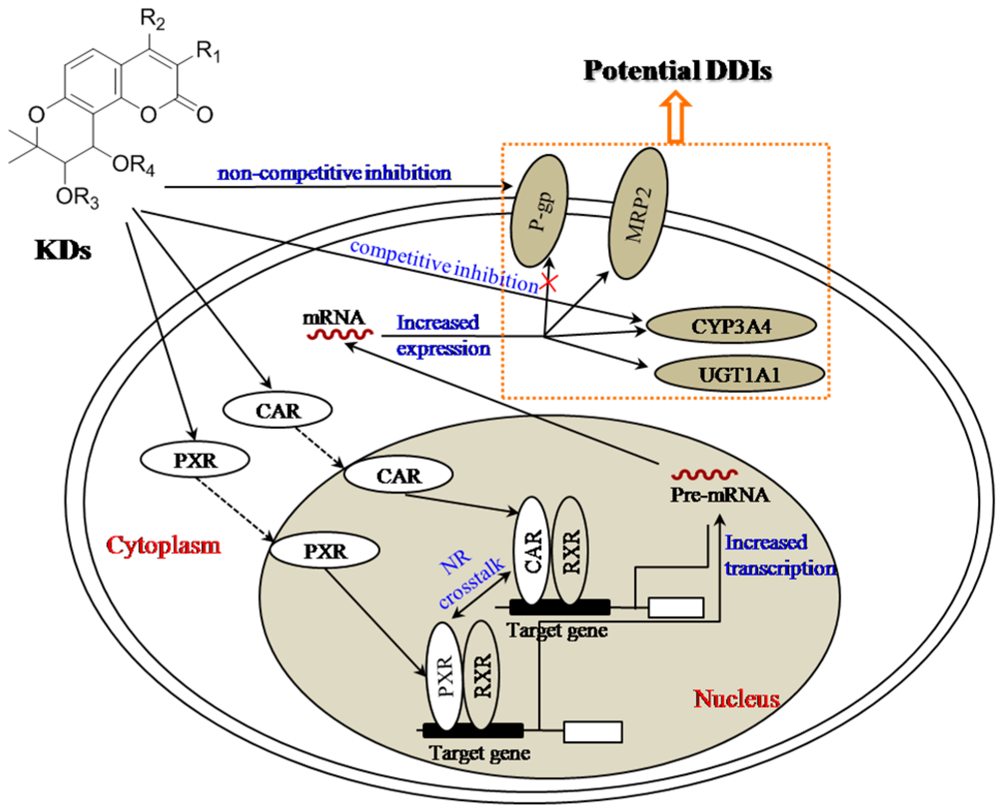 The nuclear receptors, in particular CAR and PXR, are responsible for many important xenobiotic responses. Initially, KDs bind to the CAR and PXR in the cytoplasm, and then CAR and PXR translocate from the cytoplasm to the nucleus of the cells. After the formation of heterodimers or heterotetramers with RXR, the complexities will bind to their corresponding DNA sites to enhance the transcriptions of pre-mRNA, which, subsequently, can be translocated into cytoplasm, and subsequently to up-regulate the protein expression of CYP3A4, UGT1A1 and MRP2, but, not to affect the protein expression of p-gp.