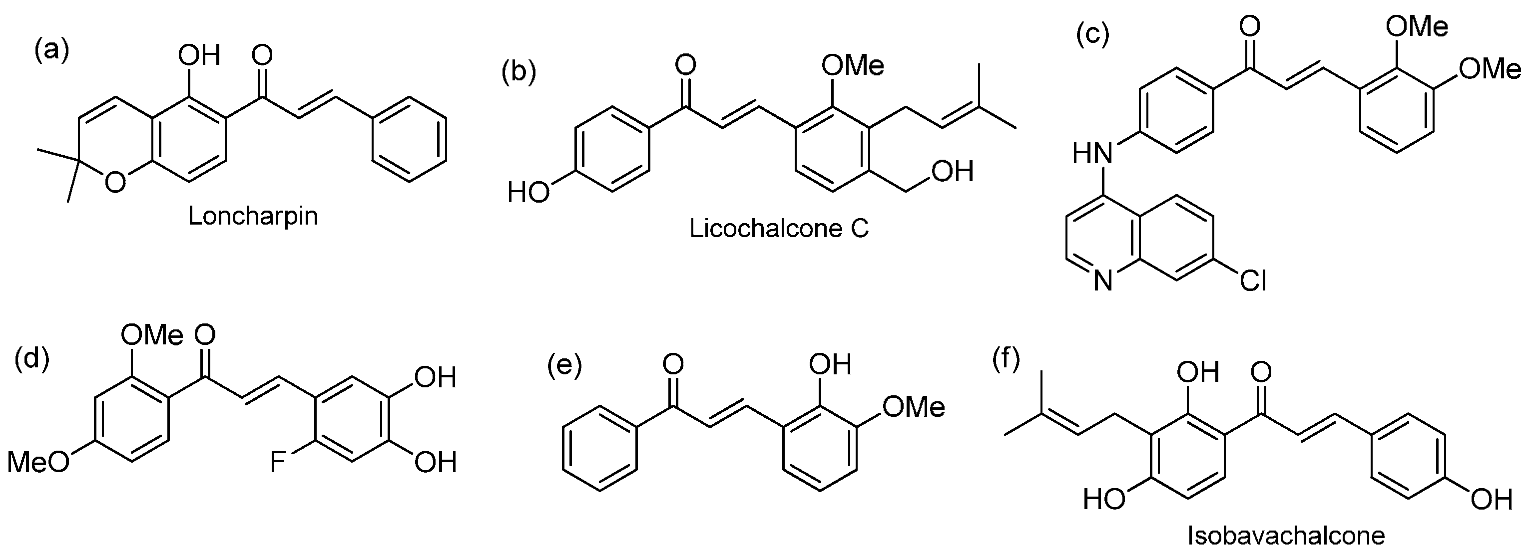 Examples of chalcone derivatives with various biological effects: (a) antiplatelet activity [8]; (b) antibacterial activity [6]; (c) antitubercular activity [9]; (d) anti-inflammatory effect [7]; (e) antiviral activity [5]; (f) anticancer activity [4].