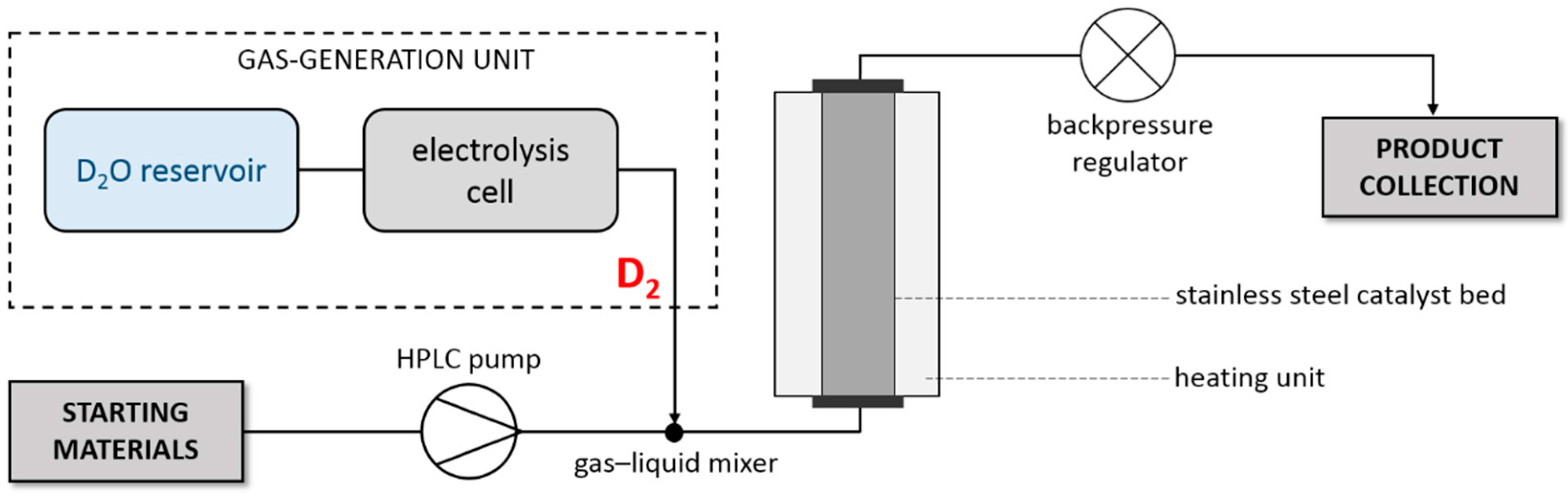 To overcome the difficulties of conventional deuterium labeling techniques, we have developed a unique flow chemistry-based method for deuteration reactions by changing the hydrogen source to deuterated water in an H-Cube® system (Figure 3) [36,60,61]. This approach is safe, as D2 gas is continuously generated in small aliquots through the electrolytic decomposition of D2O, the consumption of which is very low, implying high deuterium efficiency. The gas generated in situ is combined with the substrate solution via a gas–liquid mixer, and the resulting mixture is transported to a filled catalyst bed, where the triphasic reaction takes place [62,63]. The purity of the D2 gas produced can be as high as 99.9%, which ensures high deuterium incorporation ratios [36,60,61]; moreover, the precise control over the reaction conditions may enhance the efficacy of the deuteration reactions [36,39,47,64,65].