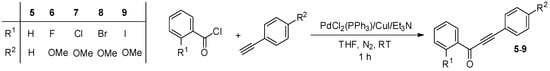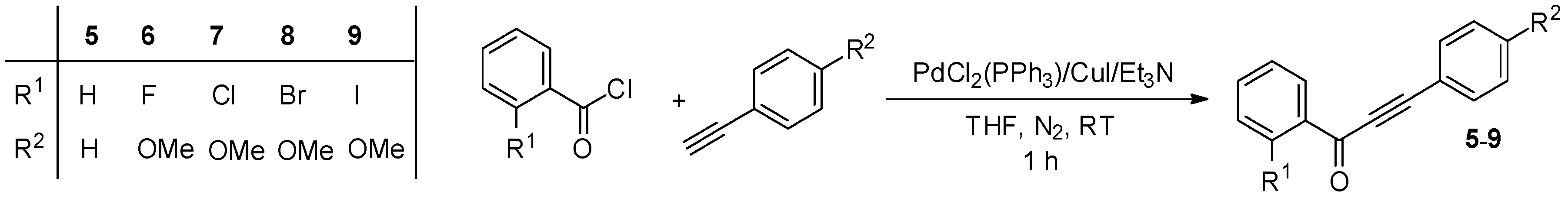 - Cox, R.J.; Ritson, D.J.; Dane, T.A.; Berge, J.; Charmant, J.P.H.; Kantacha, A. Room temperature palladium catalysed coupling of acyl chlorides with terminal alkynes. Chem. Commun. 2005, 1037–1039. [Google Scholar] [CrossRef] [PubMed]