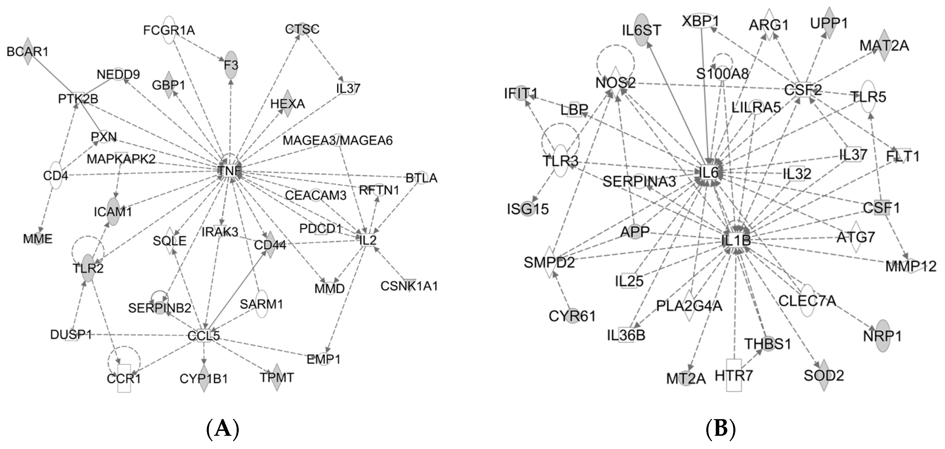 Biological pathways analysis of differentially expressed proteins in HH4 cells. (A) Top network functions of cell-to-cell signaling and interaction, inflammatory response, cellular movement and (B) immune cell trafficking using Ingenuity Pathways Analysis (IPA). Solid lines: direct known interactions. Dashed lines: suspected or indirect interactions. White: proteins known to be in the network but not identified in our study.