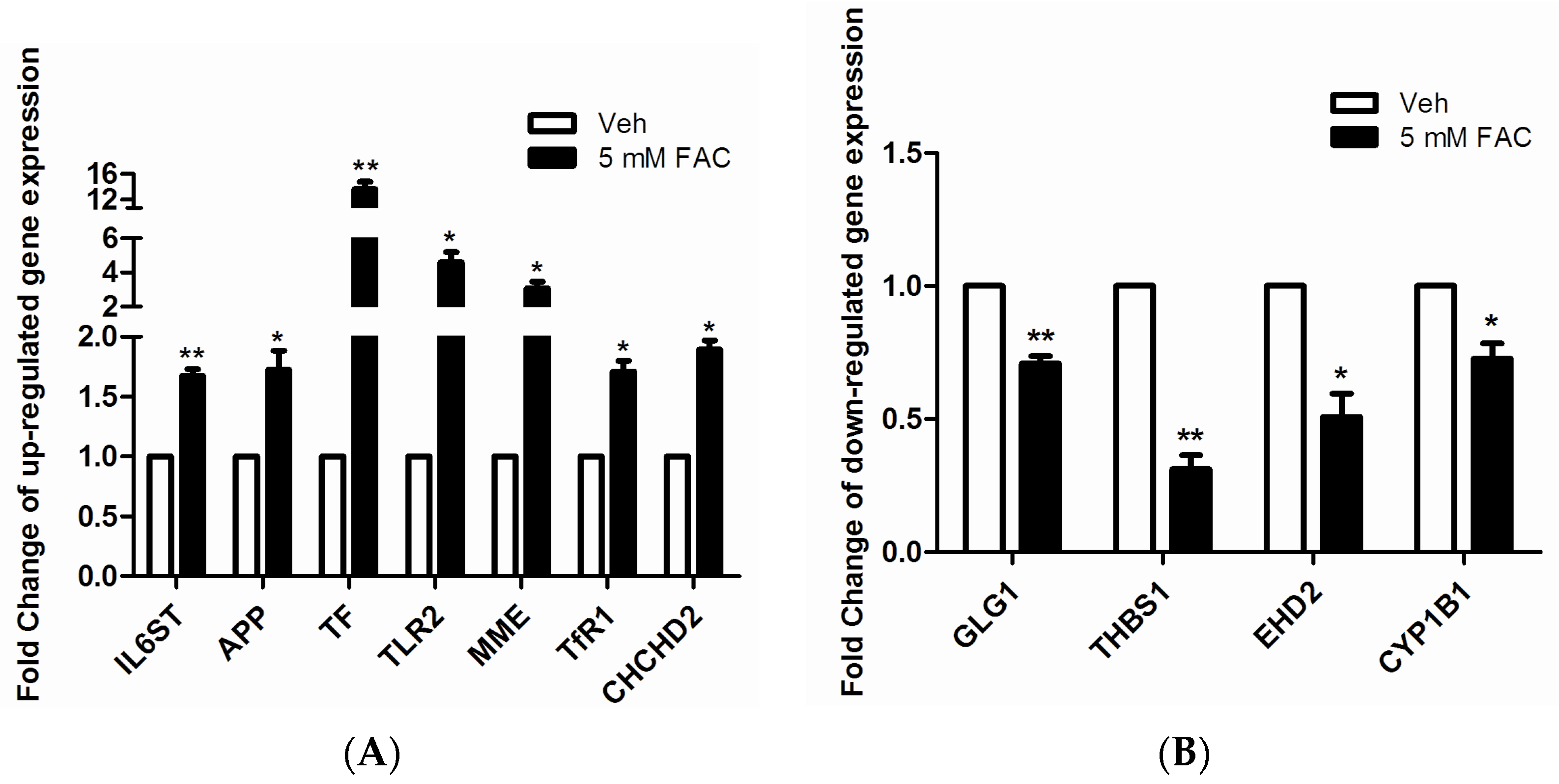 In order to verify the accuracy of protein identifications made by LC-MS/MS, we randomly selected 11 proteins from 93 differentially expressed proteins to validate their mRNA levels. The results, as shown in Figure 3A, indicate when HH4 cells were treated with 5 mM FAC for 24 h, mRNA levels of gene IL6ST, APP, TF, TLR2, MME, TfR1 and CHCHD2 increased 1.7, 1.7, 13.6, 4.6, 3.1, 1.7, and 1.9 times, respectively compared to untreated HH4 cells. In addition, as shown in Figure 3B, the mRNA levels of GLG1, THBS1, EHD2 and CYP1B1 reduced 0.7, 0.3, 0.5 and 0.7 times, respectively in FAC-treated cells compared to untreated HH4 cells. Our findings are consistent with the results from proteomic mass spectroscopy.