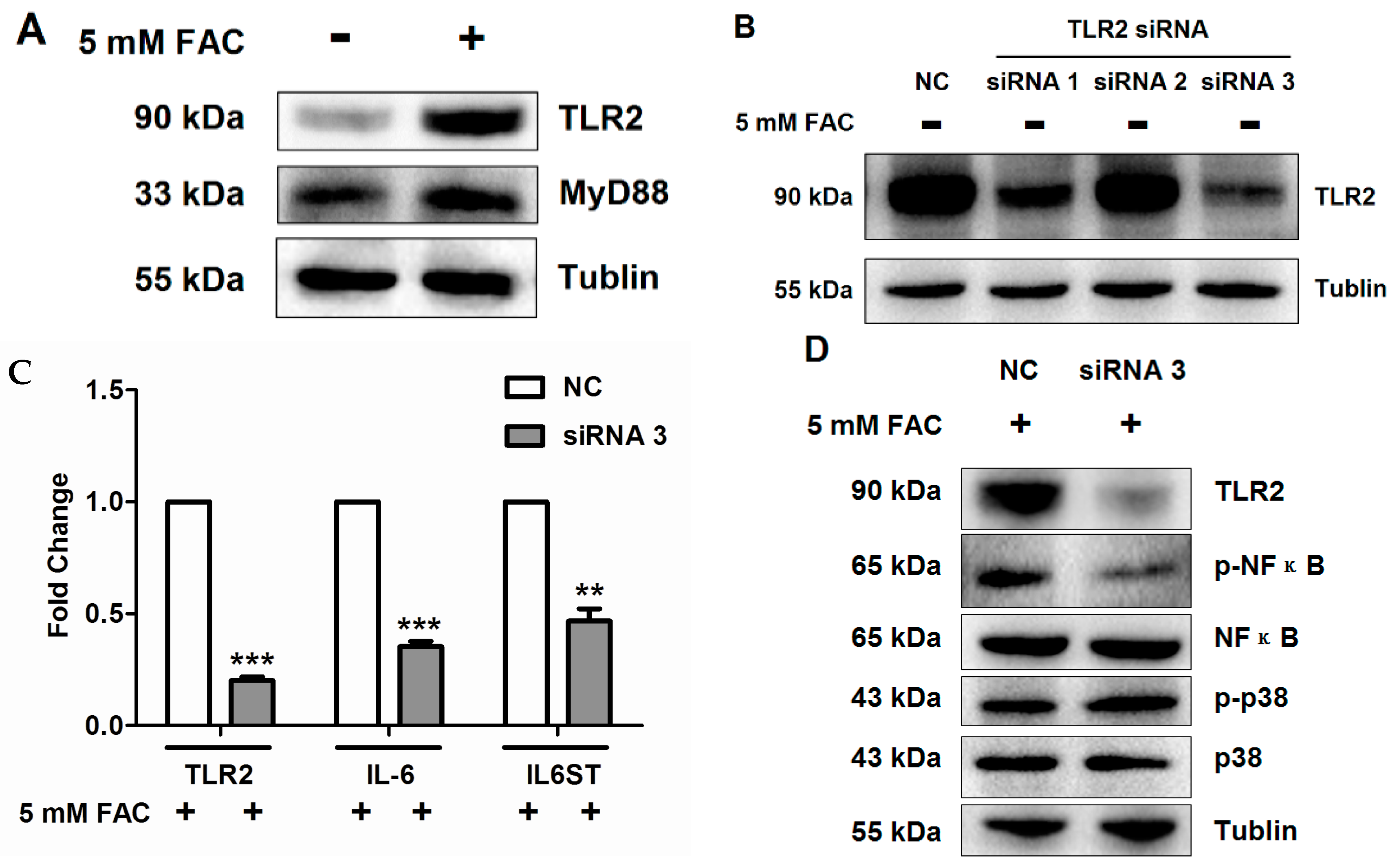 As shown in Figure 5B, inhibition using siRNA significantly reduced protein levels of TLR2. In addition, inhibition of TLR2 markedly decreased the expression of IL-6 and IL6ST at transcriptional level in FAC-treated HH4 cells, compared to untreated cells (Figure 5C). Our data also indicated p-NF-κB but not p-p38 involving in activation of TLR2-IL6 pathway (Figure 5C,D).Taken together, these results suggested that TLR2-mediated inflammatory response triggered by FAC induced the expression of IL-6 through activating the NF-κB pathway rather than p38 pathway in HH4 cells.