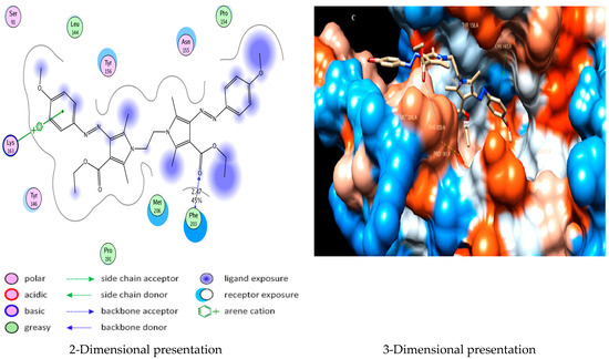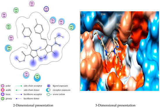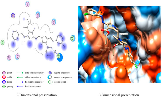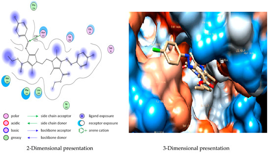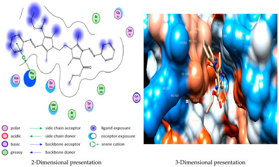 Docking studies of compound 5d showing hydrogen bond interaction between nitrogen atom of azo group moiety, as it acts as a hydrogen bond acceptor with the side chain of Asn155 (2.49 Å) with a strength of 11% (Figure 4). while docking studies of compound 5e showing hydrogen bond interaction between carbonyl group moiety, as it acts as a hydrogen bond acceptor with the side chain of Phe203 (2.96 Å) with a strength of 15% (Figure 5).