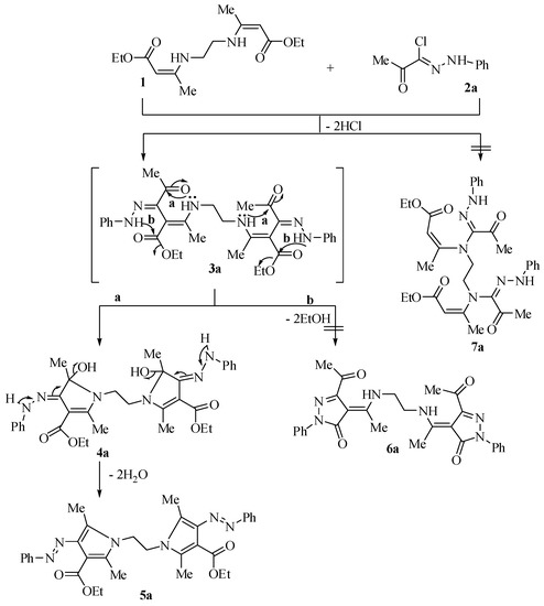 Treatment of compound 1 with a α-ketohydrazonoyl halide (2a) [28,29] in (1:2 molar ratios), in dry benzene at refluxing temperature in the presence of triethylamine (2 molar ratio) afforded the bis-pyrrole derivative 5a (Scheme 1). The structure of compound 5a was elucidated from its spectroscopic, as well as elemental analytical data. Its 1H-NMR spectrum revealed a triplet signal at δ 1.13 (J = 7.1 Hz) due to CH3 protons, two singlet signals at δ 2.17 and 2.34 due to two CH3 protons and a quartet signal at δ 4.14 (J = 7.1 Hz) due to CH2 protons, a singlet signal δ 4.31 due to NCH2 protons, in addition to an aromatic multiplet in the region 7.40–7.68 ppm. This spectroscopic analysis allows ruling out structures 6a and 7a. To account for the formation of the product 5a, it is assumed that the reaction initially proceeds via an initial nucleophilic substitution to give the intermediate 3a, which underwent intramolecular cyclization followed by the elimination of two water molecules to afford the final product 5a.