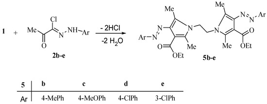 Prompted by the aforementioned results, and to generalize this reaction, the behavior of the hydrazonoyl halides 2b–e [30] towards compound 1 was studied, under the same experimental conditions, which led to the respective bis-pyrrole derivatives 5b–e (Scheme 2).