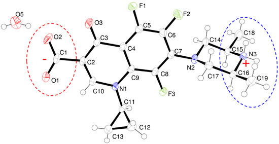 Single-crystal and powder X-ray diffraction techniques are the most suitable and commonly utilized tools to study and characterize polymorphs in pharmaceutical solids because they provide unequivocal proof of polymorphism existence [18]. Following our ongoing research to determine the crystal structures of APIs [21,22,23,24,25,26,27,28,29,30], we report here for the first time two crystalline structures of ORBI. The first ORBI crystal structure, which was determined by single-crystal X-ray diffraction, shows the ORBI molecule in a zwitterionic form. Because the crystal is a hemihydrate, this structure is termed the ORBI hemihydrate form. ORBI hemihydrate was characterized by thermal analysis (TG/DTA), infrared spectroscopy, and powder X-ray diffraction. A second crystalline form, the ORBI anhydrous form obtained from the hemihydrate form by heating it, is also reported. The solid-state phase transformation between the ORBI anhydrous and hemihydrate forms during wetting and drying is presented. The equilibrium solubility of the hemihydrate and anhydrous forms were compared after 48 h (at 150 rpm and 25 °C) in a physiological pH range (~1 to 7.5) to assess the impact of the crystal structure differences on solubility.