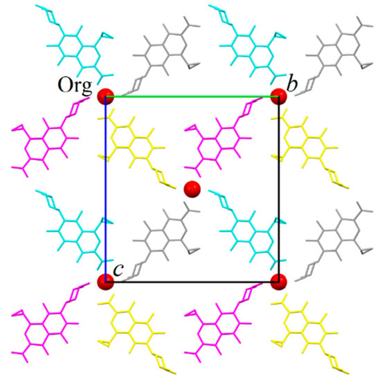 Partial packing of ORBI hemihydrate form showing a layer formed normal to the unit cell a axis. The layer was generated from the asymmetric unit applying the symmetry operations included in Figure 4 captions. The colour scheme refers to four of the eight equivalents by symmetry positions of the C2221 space group. Water oxygen atoms are represented as red spheres. Hydrogens were omitted for clarity.
