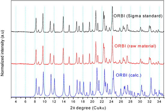 Figure 7 shows that the experimental Powder X-ray Diffraction (PXRD) patterns of the ORBI standard (Sigma) and the ORBI raw material are matched, indicating that the two ground materials crystallize in the same crystal phase. Moreover, both patterns match the calculated PXRD of the ORBI hemihydrate form for which crystal structure was determined herein.